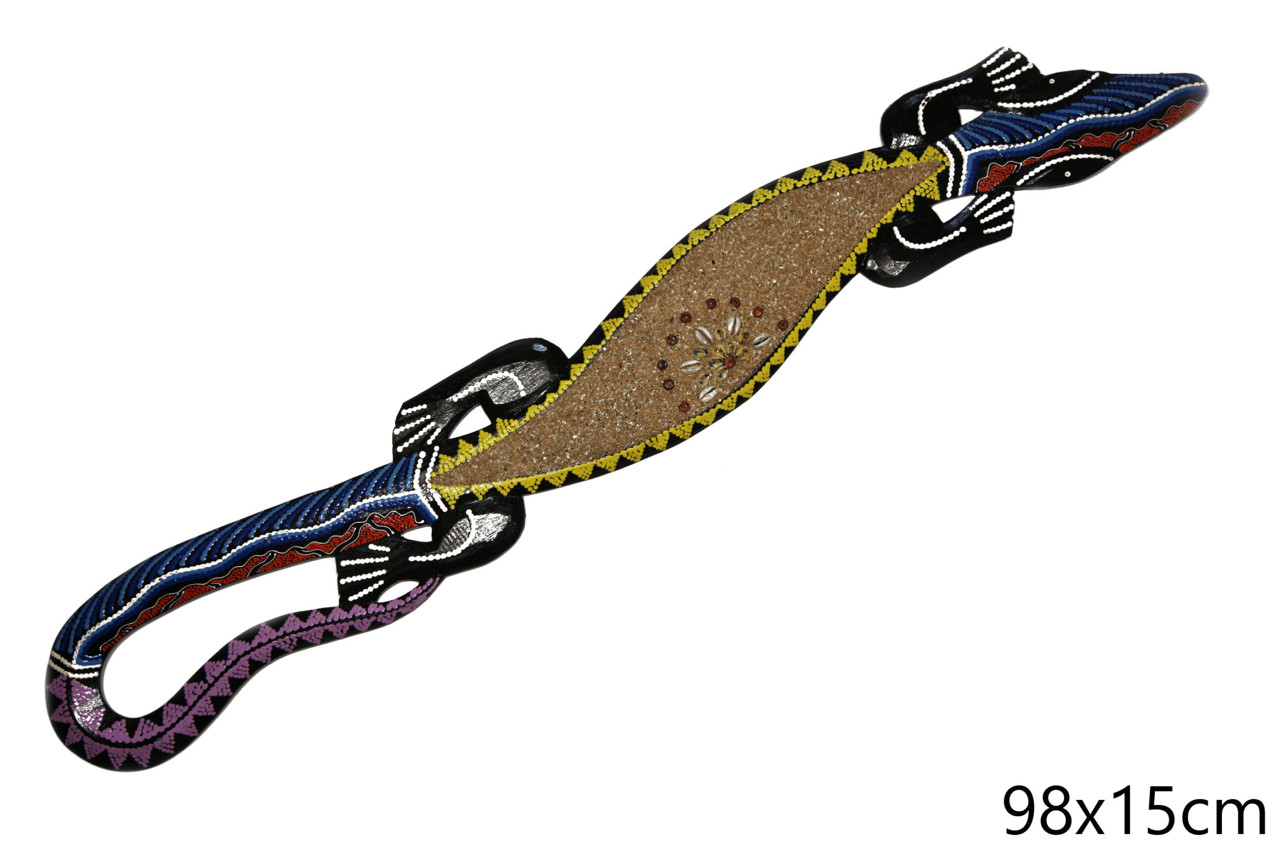 Naslovna » Trgovina » Suveniri od drva » Crni gušter s raznobojnim šarama, smeđim pijeskom i školjkama, 100cm