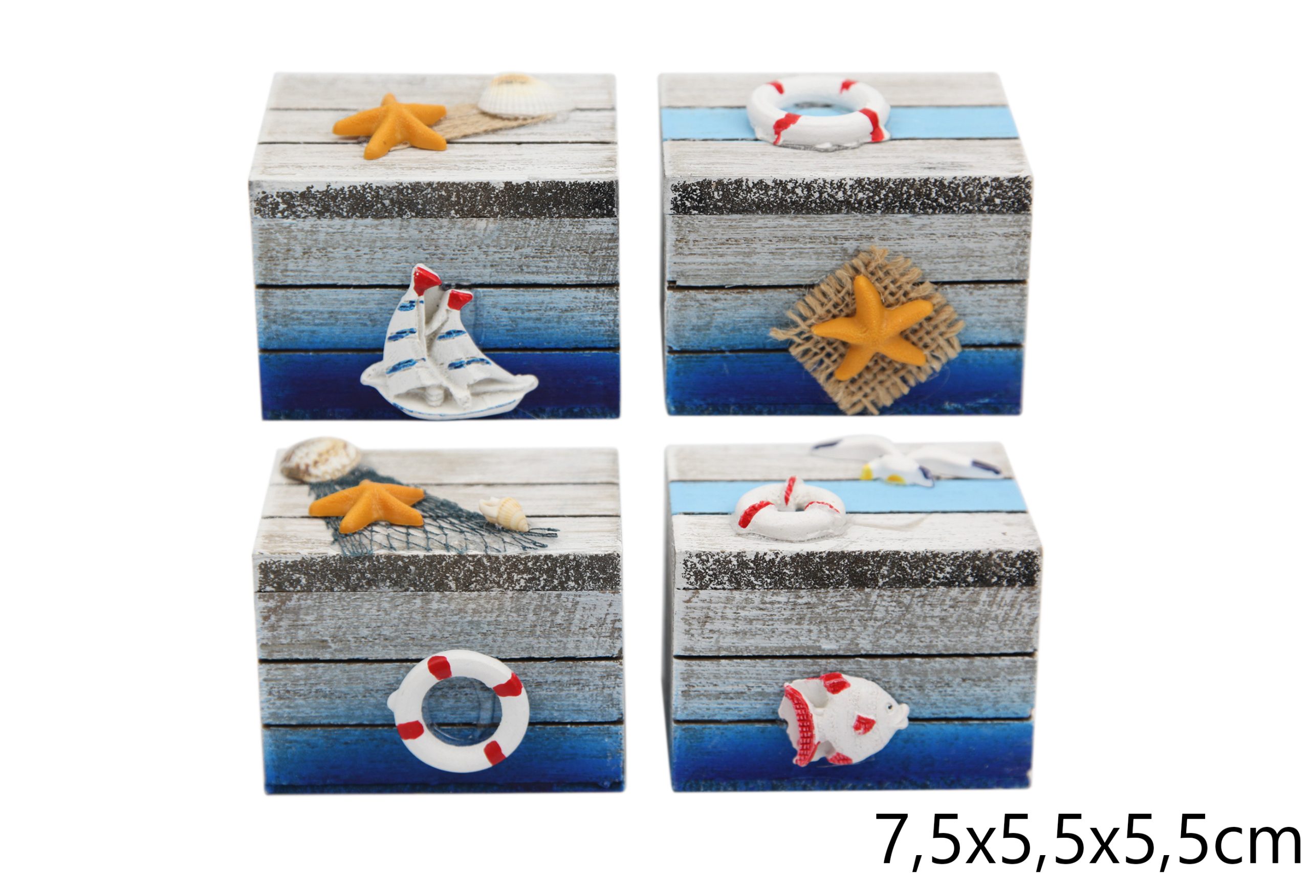 Drveni natural-plavi sanduci s morskim motivima, S (SET 4 kom.)