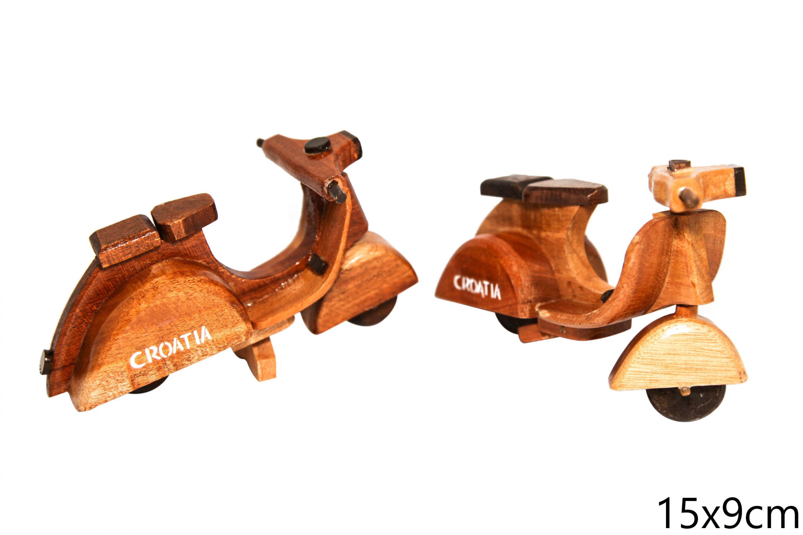 Drvena natural Vespa, s natpisom Croatia, volan joj se okreće, ima nogar te stoga može uspravno stajati.